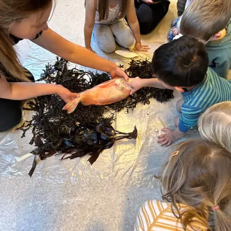 Johanna fra "sjøsjukt" fortalte og viste oss mange forskjellige ting fra havet. Hun hadde vært ute tidlig på morgenen og plukket med seg masse spennende🐚🦪🪸🤩 Men blant alt dette fine var det også mye søppel😞 Hun snakket om viktigheten av å ikke kaste søppel i naturen, og hva som skjer visst fisk eller hval får dette i seg. Hun hadde også med seg en fisk, uer, som vi studerte☺️ Det var oppslukte barn som fulgte nøye med, så gøy🤩