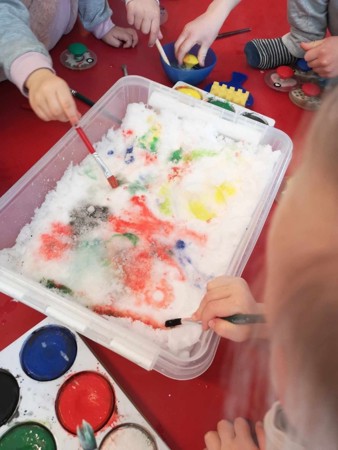 Et siste snøfall kom i april. Vi tok snøen inn og barna fikk male på den i ulike farger. De synes det var gøy at det gikk ann å male på snøen og viste stolt frem kunstverket til resten av barnehagen.
