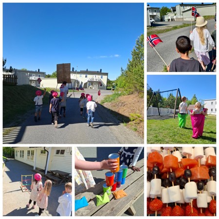 Vi øvde på å gå i tog, spiste pølser, is og fruktspyd. Vi avsluttet dagen med ulike 17. Mai leker 🥳🤹♂️