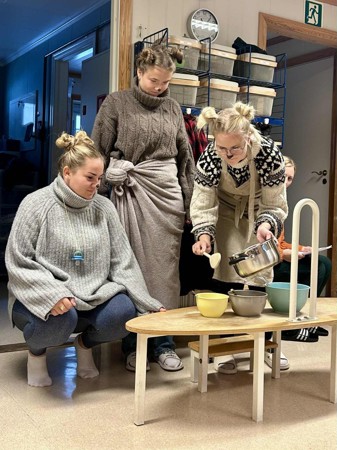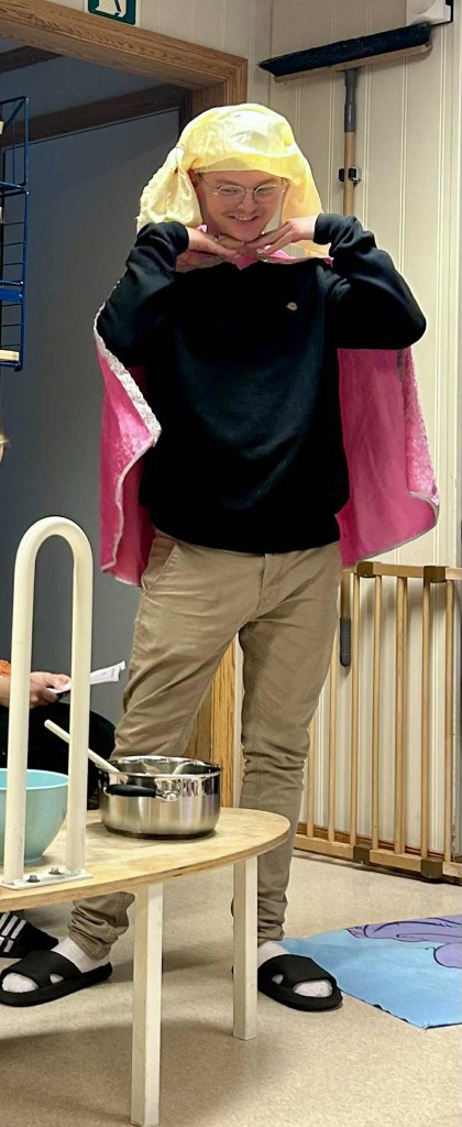 Her holder de ansatte skuespill for barna. Barna synes det er spennende og morsomt, når de voksne i barnehagen byr på seg selv :) "Eventyret om Gullhår og de tre bjørnene".